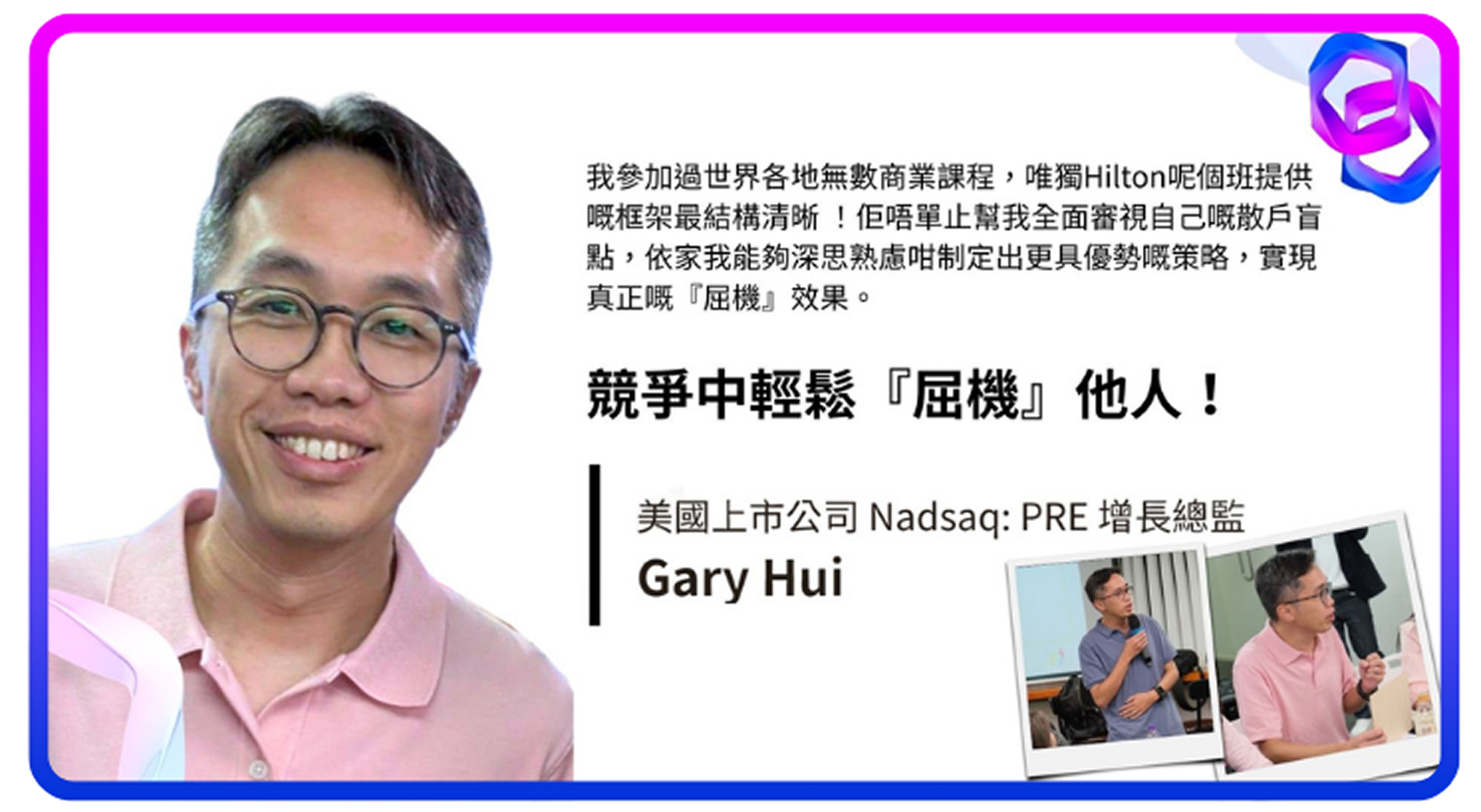 我以前很想學退休股的課程,在香港一個機緣的關係,遇到Hilton這個財記股名思師,學到很多實用的東西,感覺到Hilton有的是真功夫!可以助我們在股場中步向成功!