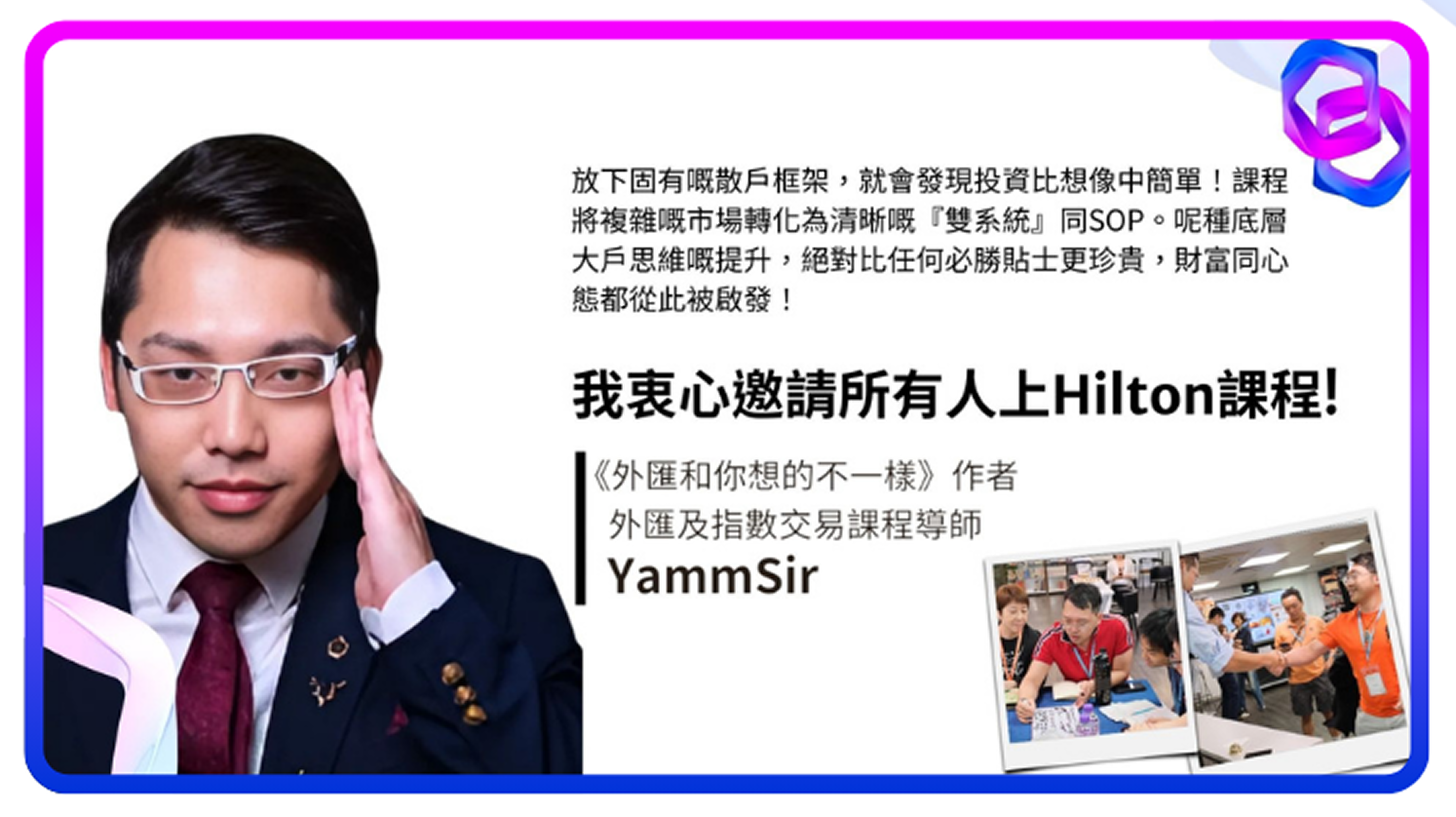 Hilton Yuen全方位大價股課程係我上過嘅財技班最全面和最有系統嘅課程,由供配合拆,到大股東和莊家操作,殼股價值,選股策略等,都講解得清楚。上完課程後,開始自己搵股票炒,最近8537和2680都賺到錢。